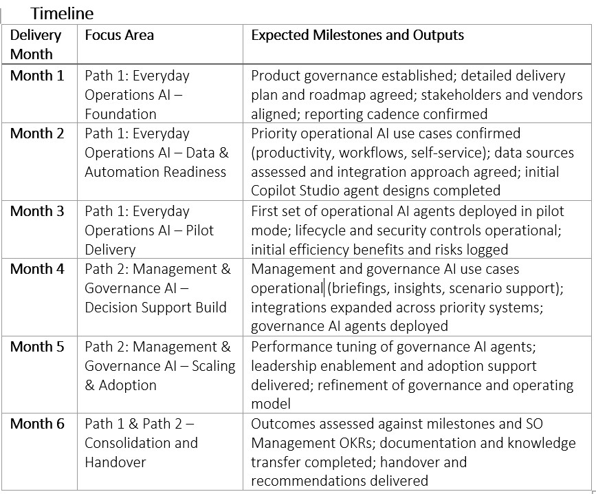 - Timeliness: Ability to meet agreed milestones and deadlines as outlined in the 6 month delivery timeline and any subsequently approved workplan.